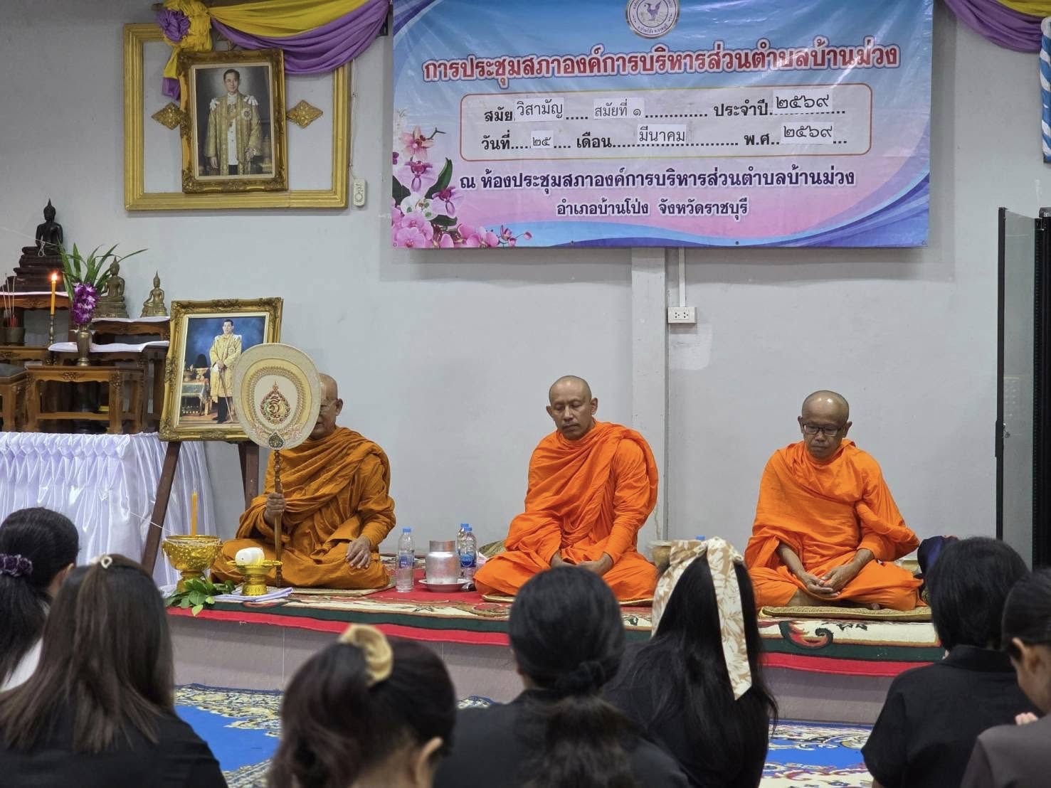 นายนราวิชญ์ จุกกะแจะ นายกองค์การบริหารส่วนตำบลบ้านม่วง พร้อมด้วย คณะผู้บริหาร พนักงานส่วนตำบลและเจ้าหน้าที่ ร่วมนิมนต์เจ้าอาวาสวัดม่วง วัดบัวงาม และวัดรับน้ำ เพื่อประกอบพิธีเจริญพระพุทธมนต์ เสริมสิริมงคลแก่คณะผู้บริหาร ข้าราชการ และเจ้าหน้าที่ ????